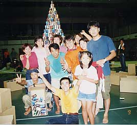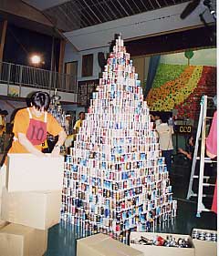 空き缶ピラミッドでギネス記録27段に挑戦! 2000年9月9日新市小学校で10人以内のチームで 30分間でショート缶を四角すいに積み上げる競技で みごと日本タイ記録26段に成功!! 出場者 後藤さん 式見さん 猪原やさん 成野さん 杉原のさん 山木さん 宮本さん 村田さん 増成さん 片山さん 応援者 杉原たさん・杉原しさん |