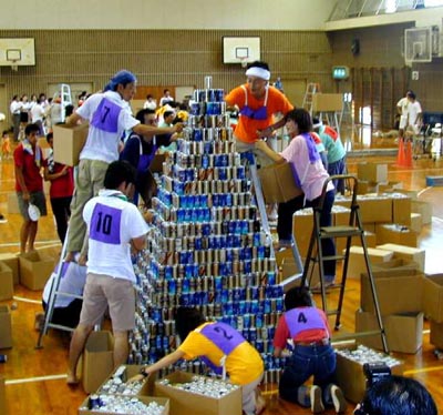 | 【2001年 結果:夢は崩れる!?】 昨日のギネスに挑戦!「空き缶ピラミッド」は、応援してくださいました皆さんには大変ご心配をお掛けいたしましたが 夢とともに崩れてしまいました。試合開始前には、商工会や各報道陣よりインタビューを受け期待がされました。 11:00過ぎに競技開始となり10段目までは早く順調でしたが、それ以降はとにかく積み上げることに集中し 頑張って28段ぐらいまで積み上げた時でした。もろくも崩れてしまいました。私が覚えている限りでは 、途中で4回崩れて修正しながらの28段、それでも底辺は30個は並べていたと思われますが、 いったん崩れるとなかなか修正は難しかったですね。 感想ですが、いやぁ〜競技開始から30分、早かったなぁ〜と感じました。あっという間の30分でした。 それと今回の空き缶はスポンサーがついたために「おにゅうの空き缶」が使用されたこともあり、積み上げている時に あき缶が滑りやすく、またスポンサーがいろいろあり空き缶の種類が微妙に違っていて缶を置く時に 少しでも空き缶どうしが当たるとずれて、我々の早く積み上げるタイプのチームにはとても不利に思えましたね。 また前回の26段をクリアするだけで、そこでのトップを狙っているのなら、まだ知らず、とにかくギネスに挑戦している 我々にとってはとても残念な結果となってしまいました。 ということで、熱き我々の”夏“は終わってしまいましたが、また今度このようなイベントがありましたら、 再度チャレンジしてみたいと思っています。 応援をしてくださいました皆様、またこのイベントを開催してくださいました関係者各位の方々に感謝の意を込めて 「ありがとう!」ございました。 |